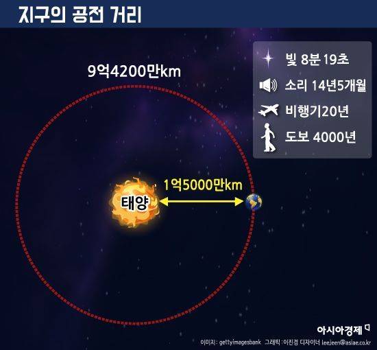 지구에서 태양까지 거리는 약 1억5000만㎞입니다. 지구의 공전궤도를 원이라고 보고, 원의 둘레를 구하는 공식 '2πr'에 대입하면 2x3.14x1억5000만㎞는 9억4200만㎞입니다. 1년 동안 지구가 태양을 도는 거리는 9억4200만㎞라는 것입니다.