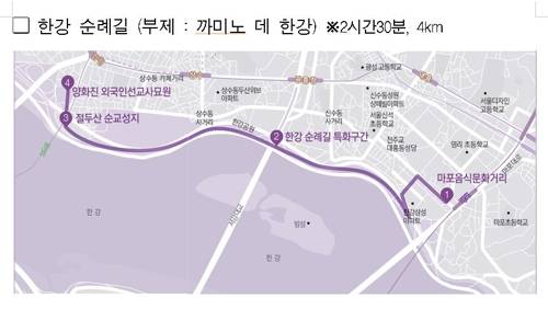 한강 순례길은 마포음식문화거리가 있는 마포역에서 출발해 마포나들목을 지나면서 한적한 한강길로 이어진다. 그 끝에는 절두산 순교성지와 양화진 외국인 선교사 묘원이 자리해 순교자들의 발자취를 느낄 수 있다.