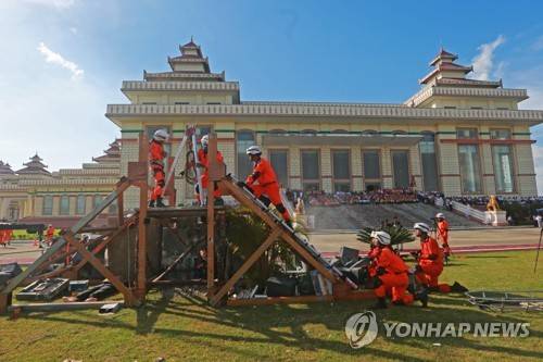 epa07017008 Members of the Myanmar Fire Services Department demonstrate a rescue operation, in front of the Parliament building in Naypyitaw, Myanmar, 13 September 2018. Myanmar government purchased 75 fire and rescue vehicle from Poland, with 50 million euros of aid loans from the Organization For Economic Co-operation and Development (OECD). EPA/HEIN HTET
