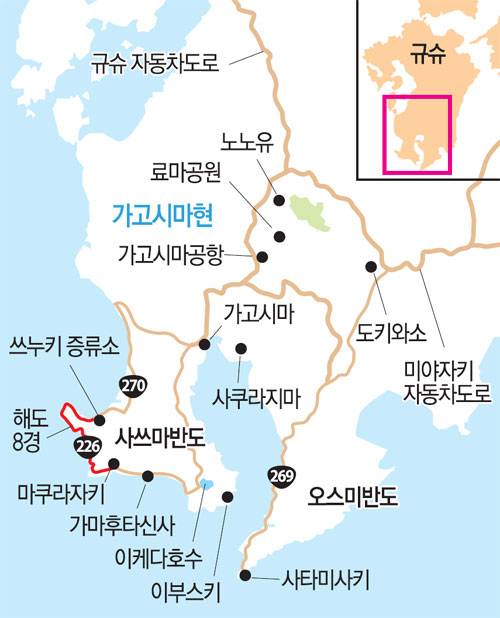 규슈 남단의 가고시마현은 남북으로 600km가 넘는다. 그래서 온대와 난대에 두루 걸쳐 있다. 그 모양은 치아를 닮았다. 양편으로 사쓰마, 오스미 두 반도가 뿌리처럼 돌출한 모습 때문이다. 오늘 소개할 곳은 그 왼편(서쪽)의 사쓰마반도. 일본의 맛 우마이의 본산인 마쿠라자키가 그 첫 번째다.
