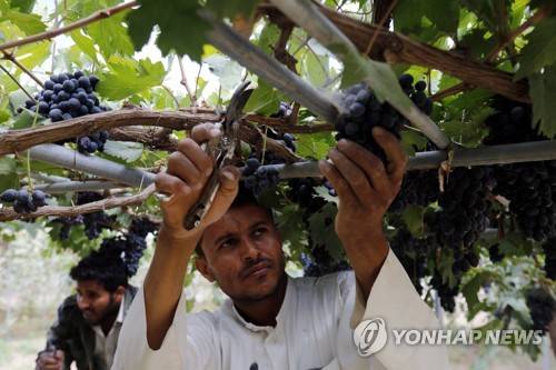 epa07020994 Yemeni farmers pick grapes at the start of the harvest in a vineyard on the outskirts of Sana?a, Yemen, 13 September 2018 (issued 14 September 2018). Sana'a is famous for producing a large quantity of Yemeni grapes. EPA/YAHYA ARHAB