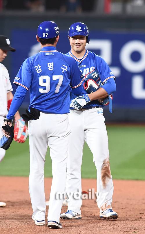 [마이데일리 = 수원 곽경훈 기자] 삼성 최영진이 15일 오후 수원 kt위즈파크에서 진행된 '2018 신한은행 MY CAR KBO리그' kt-삼성의 경기에서 5회초 무사 1루에서 2루타를 때린뒤 미소를 짓고있다.- ⓒ마이데일리(www.mydaily.co.kr). 무단전재&재배포 금지 -