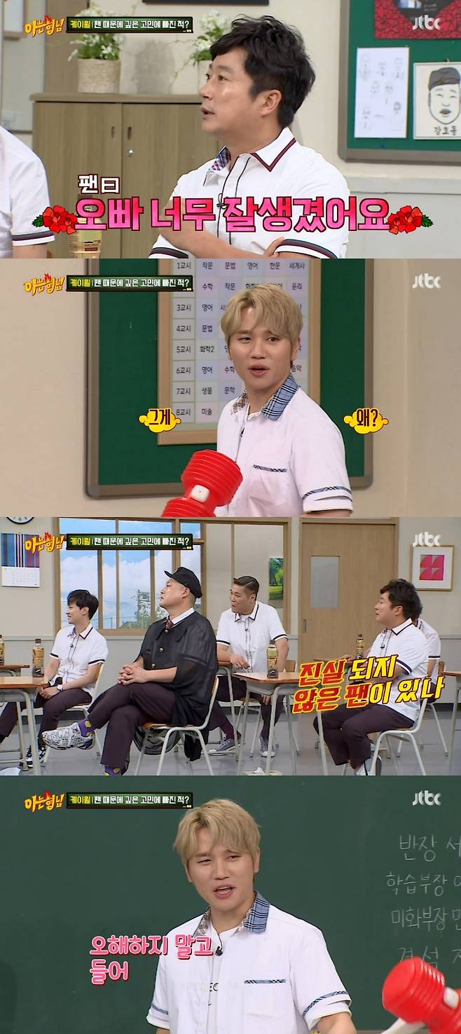 이에 케이윌은 "오해하지 말고 들어라. 팬 중에 내 얼빠가 많다"고 밝혀 형님들의 웃음을 샀다. 얼빠란 능력에 상관없이 오로지 얼굴만 좋아하는 팬을 의미한다. (사진=JTBC '아는 형님' 캡처)