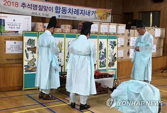 (춘천=연합뉴스) 추석 명절을 10여일 앞둔 16일 강원 춘천시 성원초등학교 체육관에서 춘천지역 북한 이탈 주민들이 합동 차례를 지내고 있다. 한국자유총연맹 강원도지부 강원북부 하나센터는 해마다 이 행사를 열고 있다. 2018.9.16[한국자유총연맹 제공]