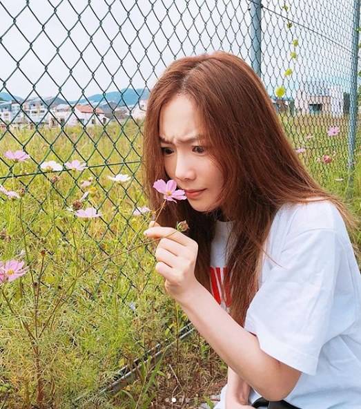 공개된 사진 속 태연은 길가에 핀 코스모스 냄새를 맡고 있다.