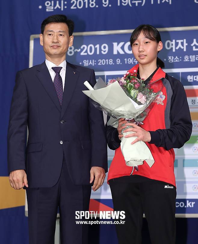 [스포티비뉴스=서울, 곽혜미 기자] 2018-2019 KOVO 여자 신인선수 드래프트가 19일 오전 서울 강남구 청담동 리베라호텔에서 열렸다. KGC인삼공사에 지명된 선명여고 이예솔이 서남원 감독과 기념 촬영을 하고 있다.