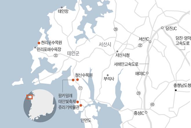 태안 하면 해안선 따라 이어지는 넓디넓은 해수욕장과 서해의 장관을 빼놓을 수 없다. 서해 바다를 끼고 있는 소원면 의항리 천리포수목원에선 파도 소리를 들으며 가을의 정취를 느낄 수 있다. 가을이 시작된 천리포수목원에선 보랏빛 꽃을 피운 맥문동을 심심찮게 만날 수 있다. 맥문동이라도 다 같지만은 않다. 자세히 보면 꽃과 잎 모양이 다른 여러 종의 맥문동을 볼 수 있어 발걸음을 자꾸 멈추게 한다. 붉고 화려한 자태를 뽐내는 석산이 조금씩 피어오르고 있었다. 꽃무릇이라고도 불리는 석산도 가을의 향연에 동참하기 시작했다.
