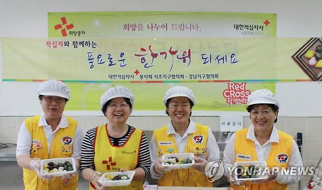 (서울=연합뉴스) 지난 20일 대한적십자사봉사회 강남지구협의회에서 적십자 봉사원들과 대한적십자사 서울특별시지사 RCY동문회 회원들이 한가위를 맞이해 강남구 관내 취약계층 어르신들을 위한 사랑의 송편을 준비하고 있다. 2018.9.21 [대한적십자사 제공]