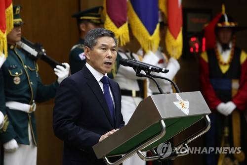 epa07036532 Newly appointed South Korean Defence Minister Jeong Kyeong-doo speaks during a inauguration ceremony for new defence minister in Seoul, South Korea, 21 September 2018. EPA/CHUNG SUNG-JUN / POOL