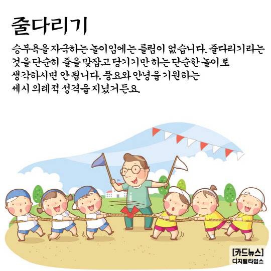 승부욕을 자극하는 놀이임에는 틀림이 없습니다. 줄다리기라는 것을 단순히 줄을 맞잡고 당기기만 하는 단순한 놀이로 생각하시면 안 됩니다. 풍요와 안녕을 기원하는 세시 의례적 성격을 지녔거든요.