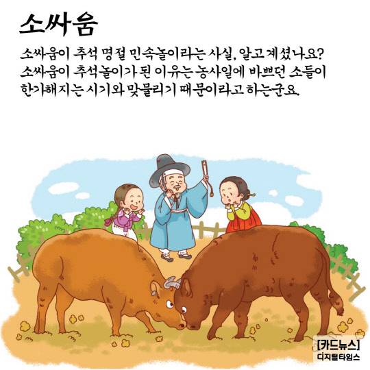 소싸움이 추석 명절 민속놀이라는 사실, 알고 계셨나요? 소싸움이 추석놀이가 된 이유는 농사일에 바쁘던 소들이 한가해지는 시기와 맞물리기 때문이라고 하는군요.