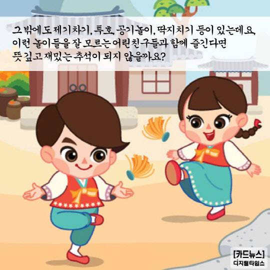 이런 놀이들을 잘 모르는 어린친구들과 함께 즐긴다면 뜻 깊고 재밌는 추석이 되지 않을까요?