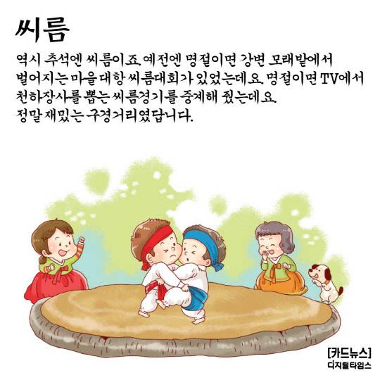 역시 추석엔 씨름이죠. 예전엔 명절이면 강변 모래밭에서 벌어지는 마을 대항 씨름대회가 있었는데요. 명절이면 TV에서 천하장사를 뽑는 씨름경기를 중계해 줬는데요. 정말 재밌는 구경거리였답니다.