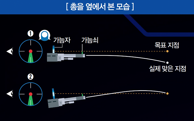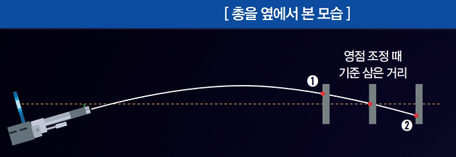영점 조정할 때 기준 삼은 지점까지의 거리를 잘 기억하자. 목표 지점이 이 거리보다 가까우면 조준한 것보다 위에 맞고(①) 멀면 아래에 맞는다(②). 결국, 기준 거리보다 가까우면 조금 아래, 멀면 위를 노려야 한다!
