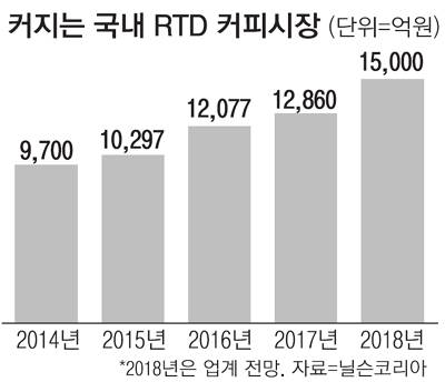 26일 닐슨코리아에 따르면 국내 RTD 커피 시장 규모는 2014년 9700억원에서 지난해 1조2860억원으로 30% 넘게 커진 데 이어 올해도 성장세를 이어가고 있다. 올해 1~7월 기준 RTD 커피음료 판매는 작년 동기 대비 4.3% 늘어난 7274억원에 달했다. 식품업계는 올 한 해 1조5000억원대에 이를 것으로 예상하고 있다.
