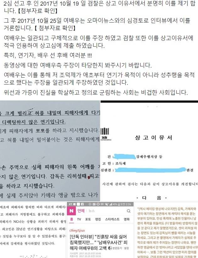 "(조씨는) 피해자의 진술만으로 증거 없이 판결이 유지됐다며 대법원 판결문 전문을 올렸다고 했다. 하지만 그건 전문이 아니라 뒷부분만 잘라서 올린 것이다. 원심(항소심) 판결문을 보면 '여러 증거들을 비춰보면'이라 돼 있다. 항소심 때 15개 이상의 증거가 제시됐다. 제 증인 심문을 포함해, 가해자 심문도 있었고, 가해자가 낸 영상과 스태프들 진술, 사진, 메이킹 필름이라고 하는 것도 들어가 있다. 그럼에도 가해자는 단순하게 피해자의 일관된 진술로 1심 판결이 항소심에서 뒤집혔고 대법원에서 확정됐다는데, 절대 아니다."