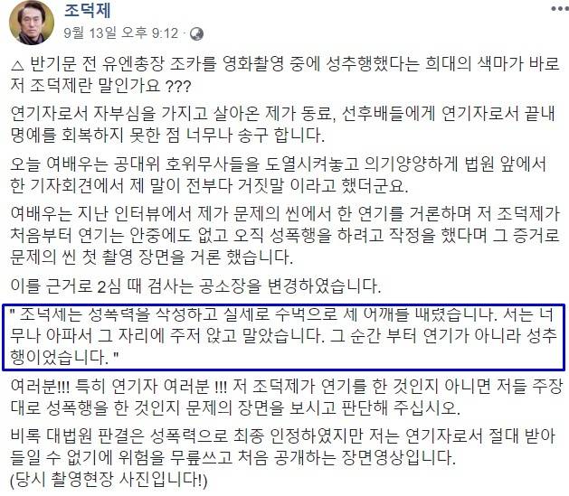 '조덕제는 성폭력을 작정하고 실제로 주먹으로 제 어깨를 때렸습니다. 저는 너무나 아파서 그 자리에 주저앉고 말았습니다. 그 순간부터 연기가 아니라 성추행이었습니다.' (9월 13일 조씨 페이스북 글 중)