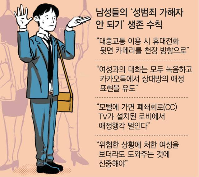 장 씨처럼 ‘성범죄 가해자 안 되기’ 생존 수칙을 공유하는 남성들이 늘고 있다. 이달 초 이른바 ‘곰탕집 성추행 사건’ 논란이 불거지면서 남성들의 불안과 불만이 커지는 분위기다. 이 사건에서 유죄 선고를 받은 남성의 아내가 억울함을 호소하며 청와대 국민청원게시판에 올린 글에 참여한 인원이 30만 명을 돌파했다. 이 사건을 계기로 생긴 인터넷 카페에는 4000여 명이 가입했고, 다음 달 27일 집회를 열 예정이다.