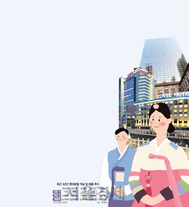 운영호텔과 객실 수가 증가하면서 매출도 가파르게 늘어나고 있다. 롯데호텔은 현재 토종 호텔 브랜드로는 최다인 국내 19개, 해외 11개 등 총 30개 호텔을 운영 중이다. 지난 2014년 17곳 6,005실에서 올해 30곳 1만619실로 70% 이상 늘어났다. 이에 따라 예상 매출은 같은 기간 6,519억원에서 2배 가까이 증가한 1조147억원으로 내다보고 있다. /이재유기자 0301@sedaily.com