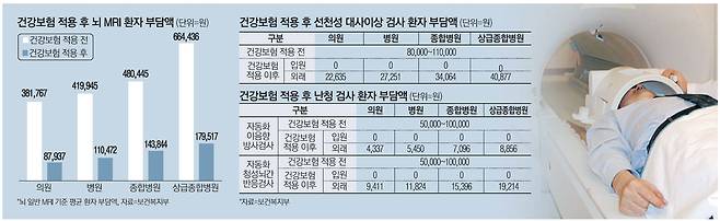 건강보험 확대 적용 전에는 병원마다 서로 다른 MRI 검사 가격을 환자가 전액 책임져야 했지만 1일부터 검사 가격이 표준화돼 환자는 이 중 일부만 부담하면 된다. 종합병원에서 뇌 일반 MRI를 받을 때 이전에는 평균 48만원을 환자가 부담했지만 앞으로는 검사 가격이 29만원으로 표준화되고 환자는 그중 50%인 14만원만 내면 된다. MRI 건강보험 확대 조치로 환자들의 검사비 부담이 크게 줄게 됐지만 일각에서는 불필요한 MRI 검사 남발을 우려하는 목소리도 제기된다. 이에 보건복지부는 환자가 A병원에서 MRI를 촬영한 뒤 진료는 B병원에 가서 받을 때 B병원이 영상판독료를 10%가량 올려 받을 수 있도록 해주되 B병원이 MRI를 재촬영하면 보험 혜택을 주지 않기로 했다. 복지부는 "이번 뇌·뇌혈관 MRI를 시작으로 내년 복부·흉부·두경부 MRI에도 건강보험을 적용한 뒤 2021년까지는 이를 모든 MRI로 확대할 계획"이라고 밝혔다.