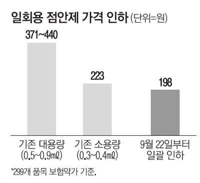 기존 일회용 대용량 점안제(0.5~0.9㎖) 보험약가는 371~440원, 소용량(0.3~0.4㎖)은 223원 수준인데 용량에 상관없이 모두 198원으로 낮추기로 한 것은 제약사들이 약가를 더 받기 위해 일회용 점안제 용량을 늘리는 꼼수를 쓰지 못하도록 하기 위해서다.