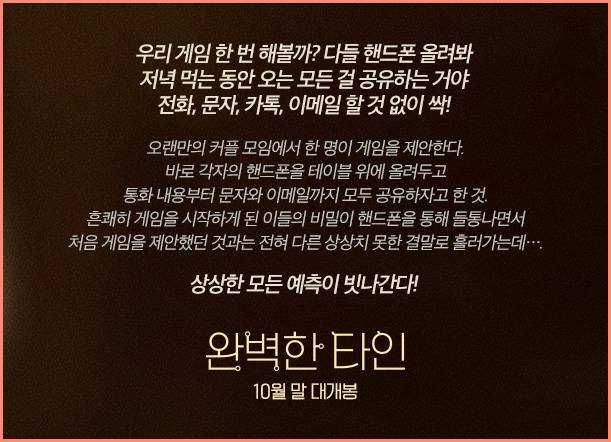 보도스틸과 함께 공개된 시놉시스를 통해 상상초월 ‘핸드폰 잠금해제 게임’의 힌트를 얻을 수 있다. “우리 게임 한 번 해볼까?”라는 한 친구의 제안으로 시작된 핸드폰 잠금해제 게임. 서로에 대해 모르는 것이 없다고 자신하는 친구들은 핸드폰을 테이블 위에 올려놓고, 각자 전략을 짜기도 하지만 상상조차 못한 비밀이 밝혀지며 저녁식사 자리는 그야말로 초토화를 예감케 한다. 시놉시스의 “상상한 모든 예측이 빗나간다!”는 내용은 관객들의 도전의식까지 자극하고 있다. 이렇듯 태연한 척 하면서도 안절부절 못하는 캐릭터들의 면면은 ‘웃픈 공감’을 자아낼 예정이다.