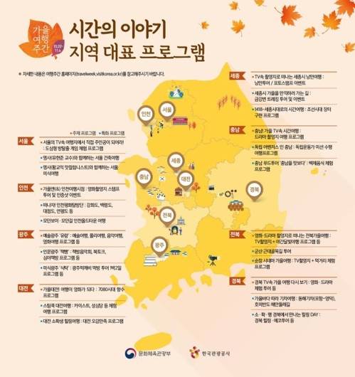 가을 여행주간에도 봄 여행주간과 마찬가지로 '텔레비전(TV) 속 여행지'가 새로운 관광지로 주목받는 흐름을 반영해 텔레비전 속 여행지들의 색다른 매력을 알리기 위한 다양한 프로그램을 마련했다.
