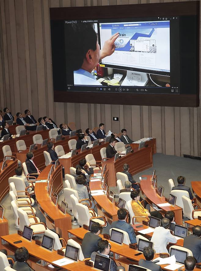 | ▲ 디지털예산회계시스템 자료 접속 시연하는 심재철 정부 비공개 예산 정보 무단열람·유출 논란의 당사자인 심재철 자유한국당 의원이 2일 오전 서울 여의도 국회에서 열린 경제분야 대정부질문에서 정부의 디지털예산회계시스템을 통해 자료를 받는 과정을 시연하는 영상을 공개하고 있다. |
