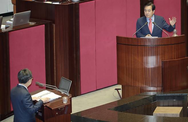 | ▲ 정부 비공개 예산 정보 무단열람 놓고 설전 벌이는 심재철-김동연 심재철 자유한국당 의원이 2일 오전 서울 여의도 국회에서 열린 경제분야 대정부질문에서 정부 비공개 예산 정보 무단열람·유출과 예산 사용 내역을 놓고 김동연 부총리 겸 기획재정부 장관과 설전을 벌이고 있다. |