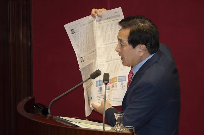 | ▲ 정부 비판 사설 들어보이는 심재철 심재철 자유한국당 의원이 2일 오전 서울 여의도 국회에서 열린 경제분야 대정부질문에서 정부 비공개 예산 정보 무단열람·유출 관련해 정부를 비판한 일간지 사설을 들어보이고 있다. |