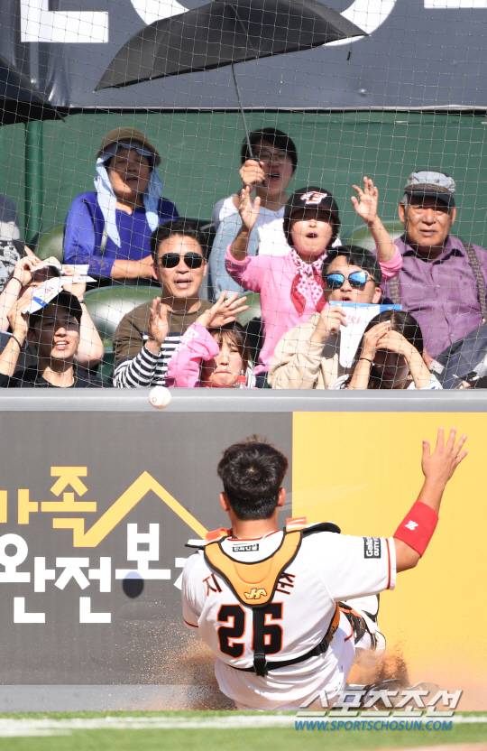 3일 오후 대전 한화생명이글스파크에서 KBO리그 한화 이글스와 롯데 자이언츠의 경기가 열렸다. 3회 한화 지성준 포수가 롯데 번즈의 파울타구를 따라갔으나 아쉽게 놓치고 있다. 대전=송정헌 기자 songs@sportschosun.com/2018.10.03/