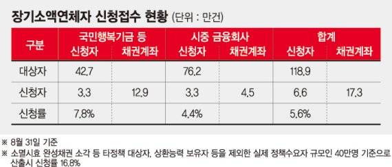 하지만 장기소액연체 채무자가 119만명으로 집계됐던 것을 감안하면 신청률은 5.6%에 불과하다. 또 소멸시효 완성채권 소각 등 타정책 대상자, 상환능력 보유자 등을 제외한 실제 정책수요자 규모인 40만명 기준으로 산출해도 신청률은 16.8% 수준이다.