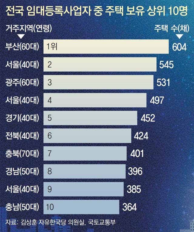 이들을 포함해 임대등록 주택 수가 많은 상위 10명이 보유한 주택을 합하면 4599채다. 1인당 평균 460채를 임대주택으로 등록해 보유하고 있는 셈이다. 실제로 이들 상위 10명 중 7명은 임대주택으로 400채 이상을 등록해 운영하고 있다. 이들 중 가장 주택 수가 적은 충남 거주 50대(10위)도 364채를 개인 명의 소유로 등록해 임대사업을 하고 있다. 상위 10명 중에는 40대가 절반이었으며 지역별로는 수도권(4명)보다는 지방(6명)이 많았다.