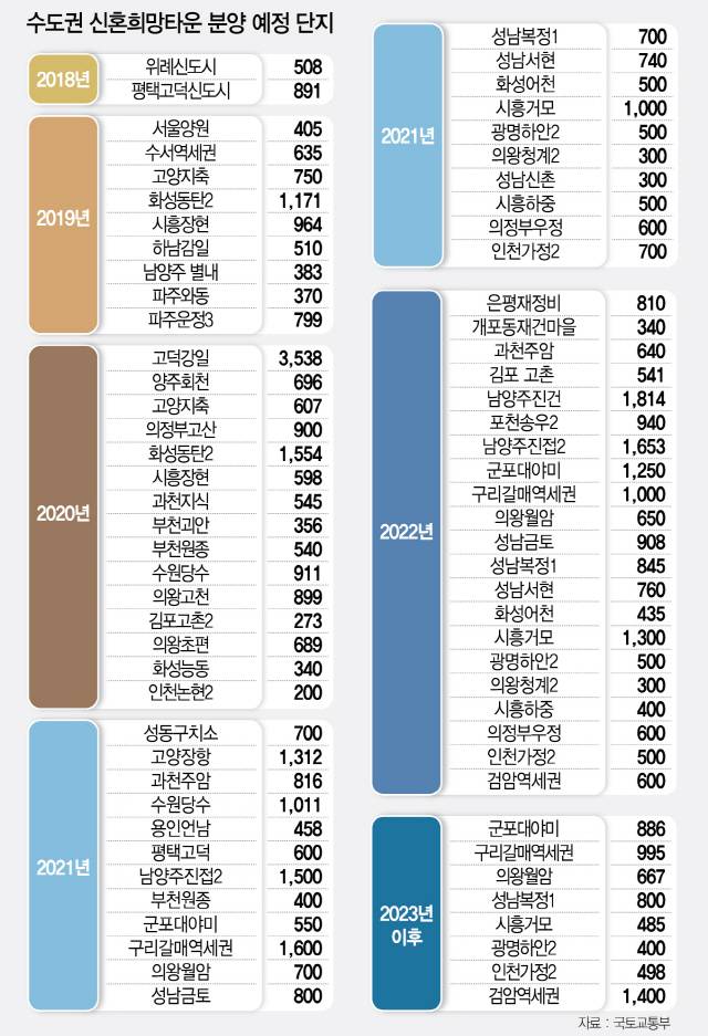 ◇연말 첫 분양되는 신혼희망타운=신혼희망타운은 무주택자인 결혼 7년 이내의 신혼부부 또는 1년 내 혼인신고 예정인 예비부부에게 주변 시세보다 20~30% 저렴한 가격으로 공급하는 아파트를 말한다. 국토교통부는 이 사업을 지난해 11월 ‘주거복지로드맵’을 통해 처음 공개했다. 이어 지난달 21일 ‘수도권 주택공급 확대방안’을 발표하면서 ‘공급 일정을 최대한 단축하겠다’고 밝힌 바 있다. 이에 올해 위례신도시(508가구)와 평택 고덕(891가구) 등 1,399가구를 시작으로 오는 2022년까지 7만1,599가구(수도권 5만3,626가구)를 신혼부부 등에게 공급할 계획이다.