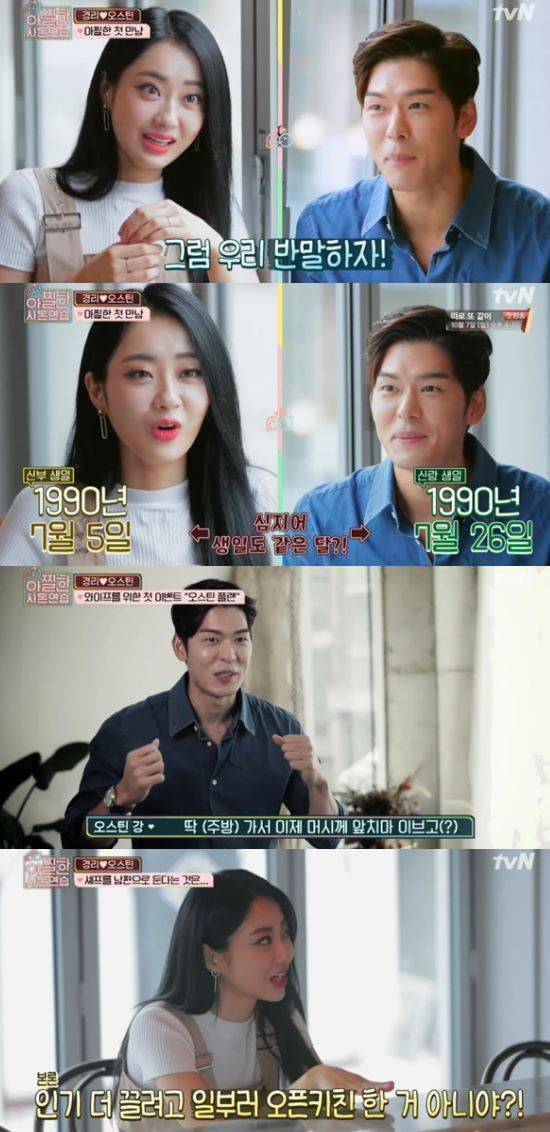 오스틴강과 경리는 1990년생 동갑내기. 외국에서 오래 살아 경어가 어색한 오스틴강은 경리에게 말을 편하게 하는 것을 제안했고, 두 사람은 만난 당일 말을 편하게 하게 됐다. 경리는 오스틴강에 대해 "키가 커서 합격이었다"고 즐거워했고, 오스틴강도 "머리부터 발끝까지 다 예뻤다"고 기뻐했다. 서로에게 좋은 첫인상을 갖게됐다.