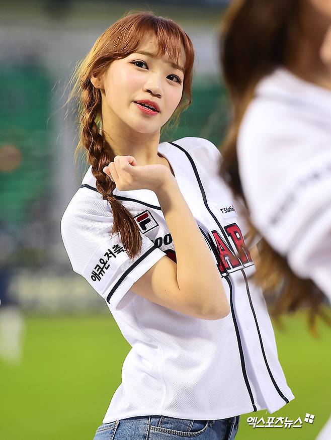 [엑스포츠뉴스 잠실, 김한준 기자] 6일 오후 서울 송파구 잠실야구장에서 열린 '2018 신한은행 MY CAR KBO리그' LG 트윈스와 두산 베어스의 경기, 아이즈원 김채원이 멋진 공연을 선보이고 있다.