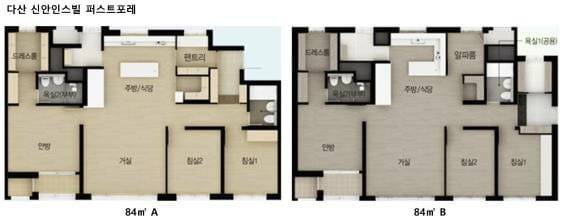 처음에는 두 평면이 비슷해보였지만 하나씩 뜯어서 살펴보니 장단점이 각기 다르다는 것을 알 수 있다. 건설사도 타입을 다양화 하면서도 형평성을 맞춰 설계하기 때문에 꼼꼼히 살펴보는 것이 좋다. 하나가 좋으면 하나가 아쉬울 수 있어서다. ‘다산 신안인스빌 퍼스트포레’의 경우, 주방이 넓고 수납 공간이 많은 구조를 원하는 수요자라면 A타입을, 침실과 자녀방 외에 또다른 알파 공간이 필요한 수요자라면 B타입을 선택하는 것이 좋다. 공간 별 면적 차이를 알고 싶다면 두 평면도를 나란히 놓고 비교하는 것을 추천한다.