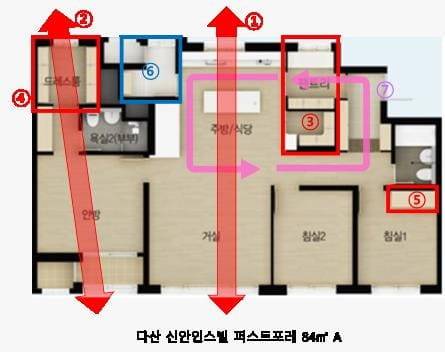 전용 84㎡ B타입 역시 거실 뿐만 아니라 안방의 드레스룸까지 맞통풍이 가능하다.(①②) 발코니를 확장하면 현관 팬트리가 제공된다.(③) 여기에는 골프백과 자전거처럼 부피가 큰 스포츠 용품을 편리하게 수납할 수 있다. 4베이 구조의 장점인 알파룸을 만들어 수납 시스템장을 하나 더 넣었다.(④) 알파룸을 팬트리가 없는 방으로 사용 할 수 있는 옵션이 있었다면 더욱 활용도가 높았을 것 같다. 안방 드레스룸의 양쪽으로 가구가 배치되어 수납이 좋다.(⑤) A타입의 주방 팬트리장이 빠진 대신 침실 붙박이장을 키워 형평성을 맞췄다.(⑥) A타입에 비해 주방이 협소한 것은 단점일 수 있다. 두 타입을 나란히 놓고 보면 이해하기 편리하다.(⑦)