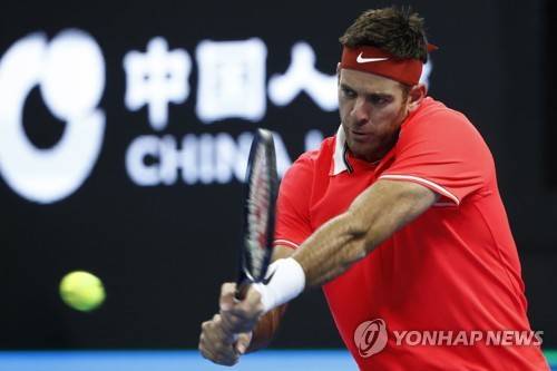 epa07076497 Juan Martin Del Potro of Argentina in action during the men's singles final match against Nikoloz Basilashvili of Georgia at the China Open tennis tournament in Beijing, China, 07 October 2018. EPA/WU HONG