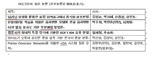 네이버는 올해 10월 개최되는 ‘HCLT2018’에서 총 5편의 논문을 접수하고 발표한다. ‘HCLT’는 매년 한글날 전후에 진행되는 한글 및 한국어 정보처리학술대회로, 이곳에서 네이버의 연구는 해마다 우수 논문으로 선정되어 왔다. 올해는 자연어 처리 및 한글 검색어와 관련한 총 3편의 논문이 우수 논문으로 선정됐다.