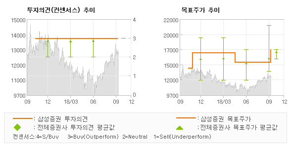 | 오늘 삼성증권에서 발표된 'BUY'의견 및 목표주가 17,000원은 전체 컨센서스 대비해서 대체적으로 평균치에 해당하는 수준으로, 이번 의견은 동종목에 대한 전체적인 흐름에서 크게 벗어나지 않은 것으로 파악되며 목표가평균 대비 4.8% 초과하고 있는 것으로 집계되었다. 참고로 최근에 목표주가를 가장 공격적으로 제시한 현대차증권에서 투자의견 'BUY'에 목표주가 21,000원을 제일 보수적인 의견을 제시한 유안타증권에서 투자의견 'BUY (M)'에 목표주가 14,500원을 제시한 바 있다. |