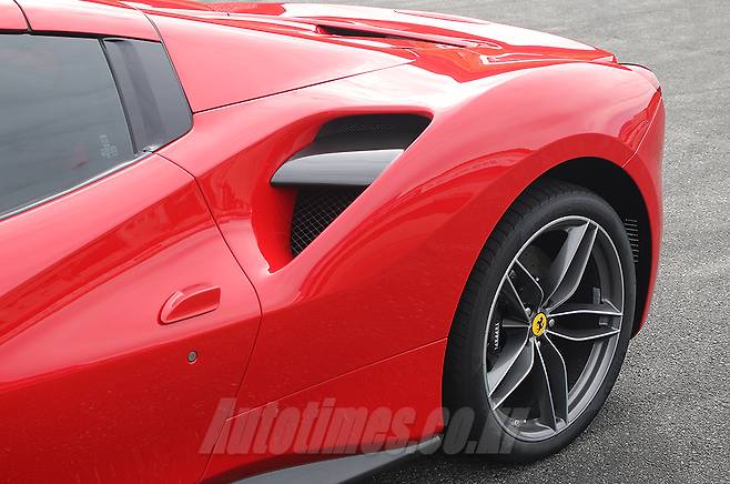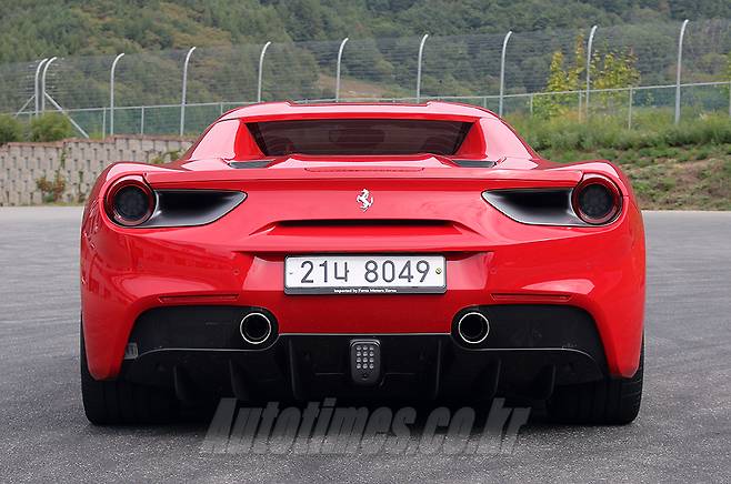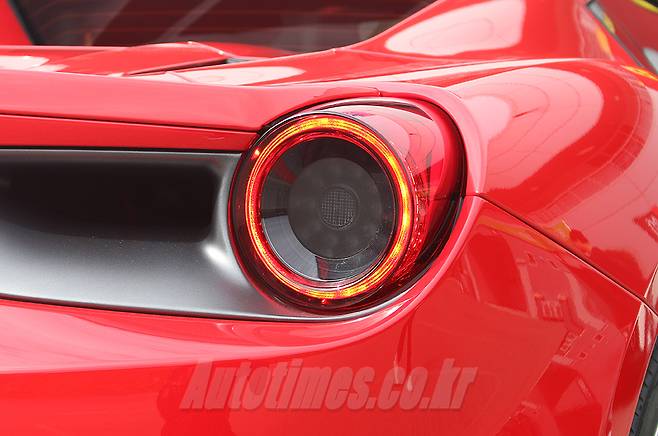 측면은 컨버터블을 감안하면 자연스러운 실루엣이다. 지붕이 그리는 선만 따라가자면 온전한 쿠페다. 리어 펜더를 파낸 듯한 흡기구는 1980년대를 장식한 308에서 영감을 얻었다. 과거 360, 430, 458에 이어 488에 이르기까지 세대 교체를 거듭할수록 보다 과감하게 변해온 결과물이다. 선의 흐름은 도어를 깎아내리고 휠하우스로 이어지면서 입체적이고 묘한 긴장감이 느껴진다. 실내에서 사이드미러를 통해 보이는 형태도 독특하다. 허리를 숙여야 손에 쥘 수 있는 도어 핸들은 물고기의 지느러미를 연상케 한다. 후면부는 페라리 전통에 따라 테일램프와 머플러를 원형으로 만들었다. 범퍼 아래엔 공기 흐름을 가다듬는 디퓨저와 속도에 따라 반응하는 가변식 플랩을 장착했다. 이밖에 엔진룸의 열 배출을 위한 여러 요소와 F1 머신의 제동등을 형상화한 안개등으로 성능을 강조했다.