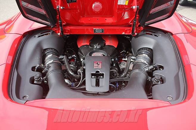 동력계는 V8 3.9ℓ 엔진에 터보차저를 더해 최고 670마력, 최대토크 77.5㎏·m의 성능을 낼 수 있다. 가변형 토크 매니지먼트를 통해 터보랙을 거의 없애고 자연흡기 엔진의 특성을 모사했지만 조금 더 가속 페달을 깊게 밟으면 터보 특유의 사운드가 귓가에 맴돌기 시작한다. 엔진이 좌석 바로 뒤에 있는 구조 덕분에 짜릿함은 배가된다. 놀라운 속도로 기어를 바꾸는 주인공은 7단 더블 클러치다. 페라리에 따르면 0→100㎞/h 가속은 3초, 0→200㎞/h는 8.3초면 된다.