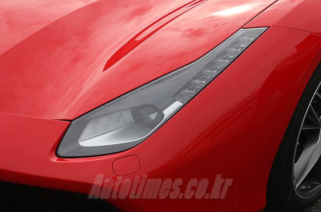 페라리의 디자인은 과거 피닌파리나의 손길을 빌렸던 때와 전혀 다른 조형미를 뽐낸다. 더 과감해졌고 유연하게 달라졌다. 488은 그 변화를 모두 담고 있다. 외관은 공기를 가를 듯한 쐐기형 디자인을 바탕으로 군더더기 없이 뽑아냈다. 브랜드 최고 수준의 공력 성능은 물론 심미성까지 고려한 결과다. 전면부는 흡기구를 통과한 다량의 공기가 차체를 누를 수 있도록 설계했다. 매서운 인상의 헤드램프는 길게 뻗어있는 형태지만 자세히 보면 의외로 단순한 구성이다. 범퍼 중앙엔 F1 머신과 닮은 흡기구를 마련해 모터스포츠 연관성을 표현했다.
