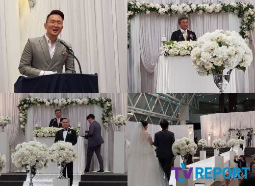 TV리포트가 입수한 본식 사진에서 김지호는 말끔한 신랑의 모습이다. 독특한 헤어스타일과 턱시도가 어우러져 세련된 느낌을 전했다. 다소 긴장한 표정이었지만, 뜨거운 환호와 박수에 미소지었다.