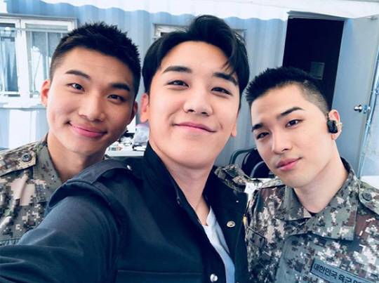 짧게 깎은 머리에 군복 차림에도 여전히 존재감을 빛내고 있는 태양과 대성. 또한 승리는 형들과의 만남에 행복한 미소를 짓고 있어 시선을 집중시켰다.