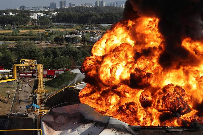 | ▲ 7일 경기도 고양시 덕양구 화전동 대한송유관공사 경인지사 저유소에서 불이 나 소방관들이 진화작업을 벌이고 있다. 2018.10.7 |