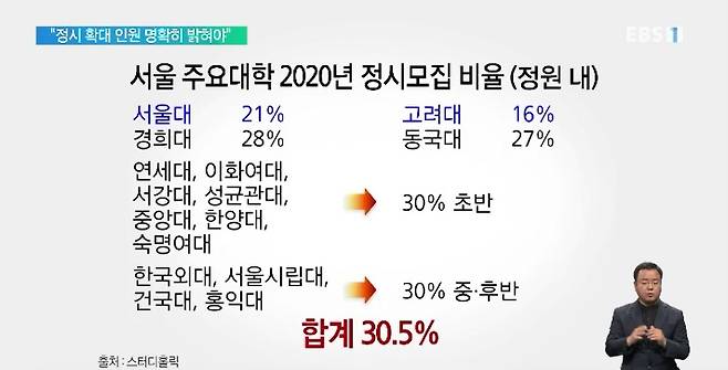 정원 내 선발인원을 기준으로, 서울대와 고려대를 제외하면 모두 30%에 근접하거나 웃돌았고, 서울 주요 15개 대학의 정시모집 비율을 합하면 30.5%에 달했습니다.