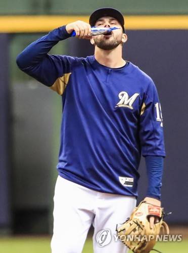 epa07087059 Milwaukee Brewers third baseman Mike Moustakas loads up a mouth full of sunflower seeds during the Brewers workout for the National League Championship Series matchup with the Los Angeles Dodgers at Miller Park in Milwaukee, Wisconsin, USA, 11 October 2018. The Brewers and Dodgers face off in the best of seven game series on 12 October. EPA/TANNEN MAURY