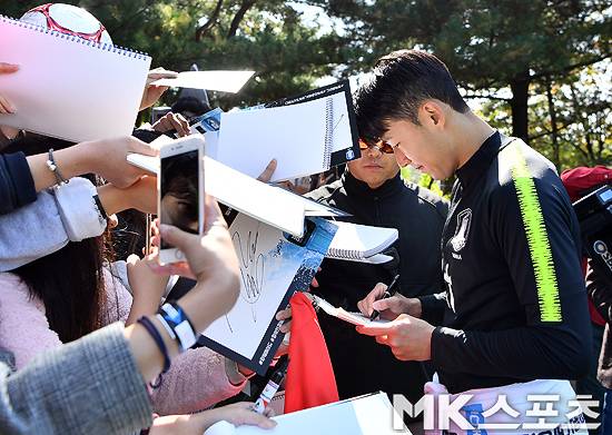 축구 대표팀 손흥민이 훈련을 마친 뒤 팬들에게 싸인을 해주고 있다.